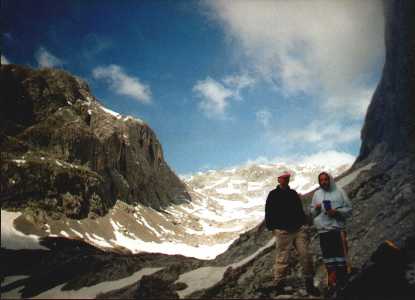 Besonders Jan schien das ganze überhaupt nichts auszumachen, er war bald immer 15 Minuten vor uns und dazwischen Klaus und Sebastian. Relativ einfach, wenn auch beschwerlich durch die Last ging es nun bis zur Torsäule und durch deren Kar. Dort beobachteten wir wieder ein paar Kletterer.