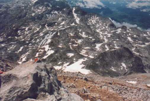 Basti war der erste, der den Gipfel erreichte und er war sehr froh darüber. Wir wünschten uns alle ein kräftiges "Berg heil", trugen uns ins Gipfelbuch ein und fotografierten. Natürlich sahen wir uns die herrliche Umgebung an. Der Blick reichte über das gesamte steinerne Meer bis hin zum Hochkönigstock. Nach der anderen Seite sahen wir die Südflanke des etwa 200m höheren Watzmannes, den Hochkalter, den hohen Göll und unter uns das Wimbachtal.